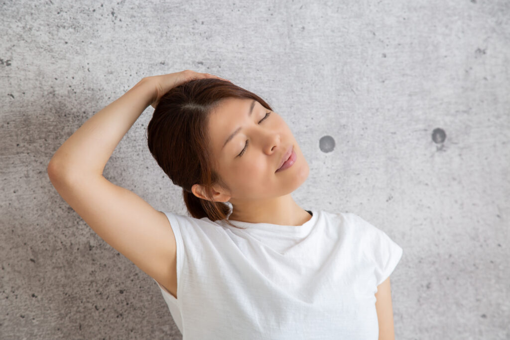 両肩をリラックスさせ、ゆっくりと首を回します。